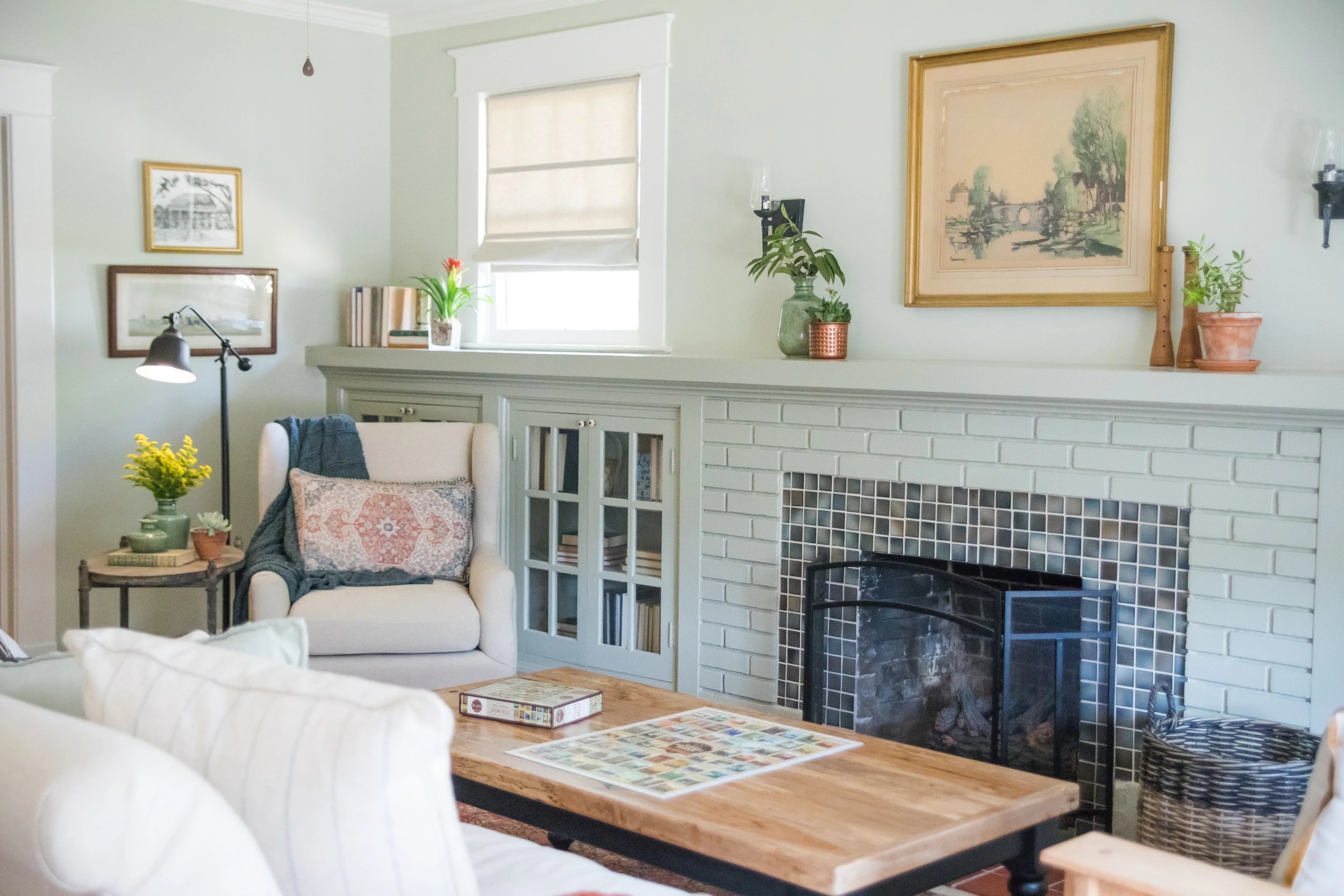 Erin loves a light, subtle color in areas with much natural light, as with the Thornton House. The craftsman living room with built-in bookshelves and fireplace feels 10x bigger in Svelte Sage.